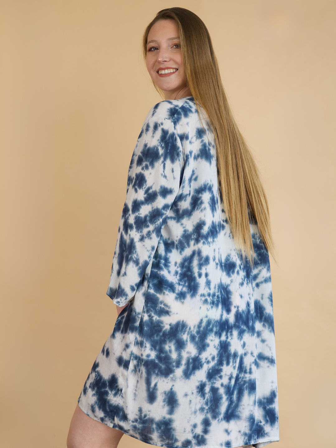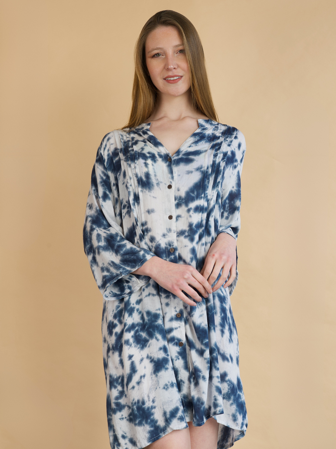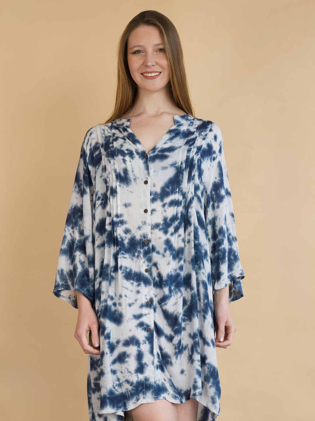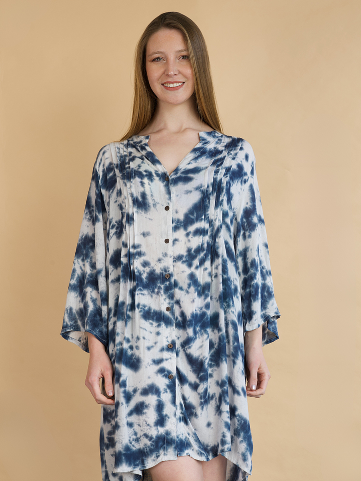 El detalle plisado en el frente añade un toque coqueto y femenino, mientras que sus mangas anchas a la altura del codo garantizan comodidad y frescura en cada movimiento. Perfecta para lucir sobre tu traje de baño favorito o como un outfit liviano y chic para un día junto al mar.