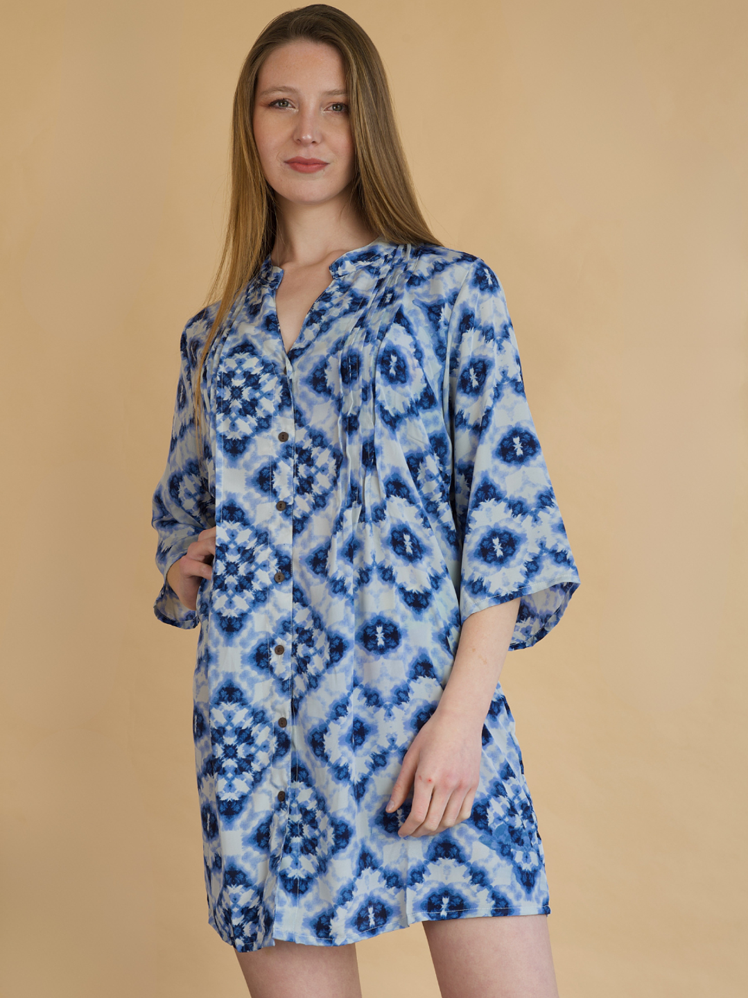 El detalle plisado en el frente añade un toque coqueto y femenino, mientras que sus mangas anchas a la altura del codo garantizan comodidad y frescura en cada movimiento. Perfecta para lucir sobre tu traje de baño favorito o como un outfit liviano y chic para un día junto al mar.